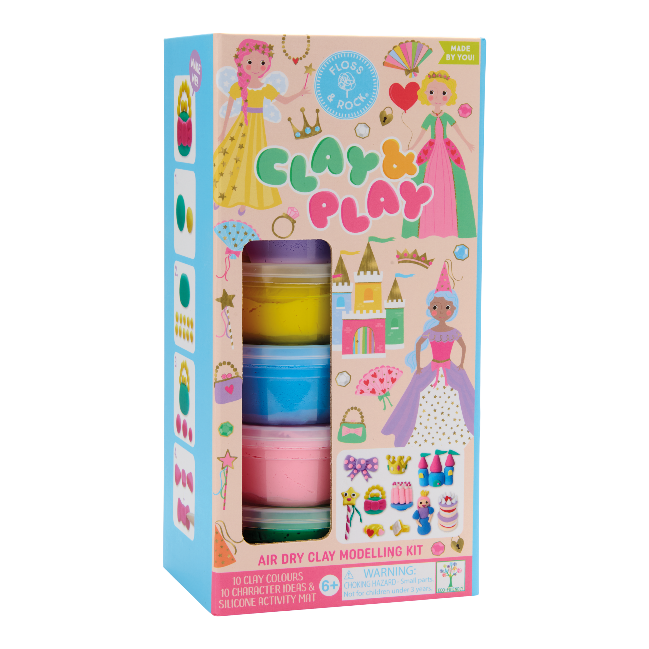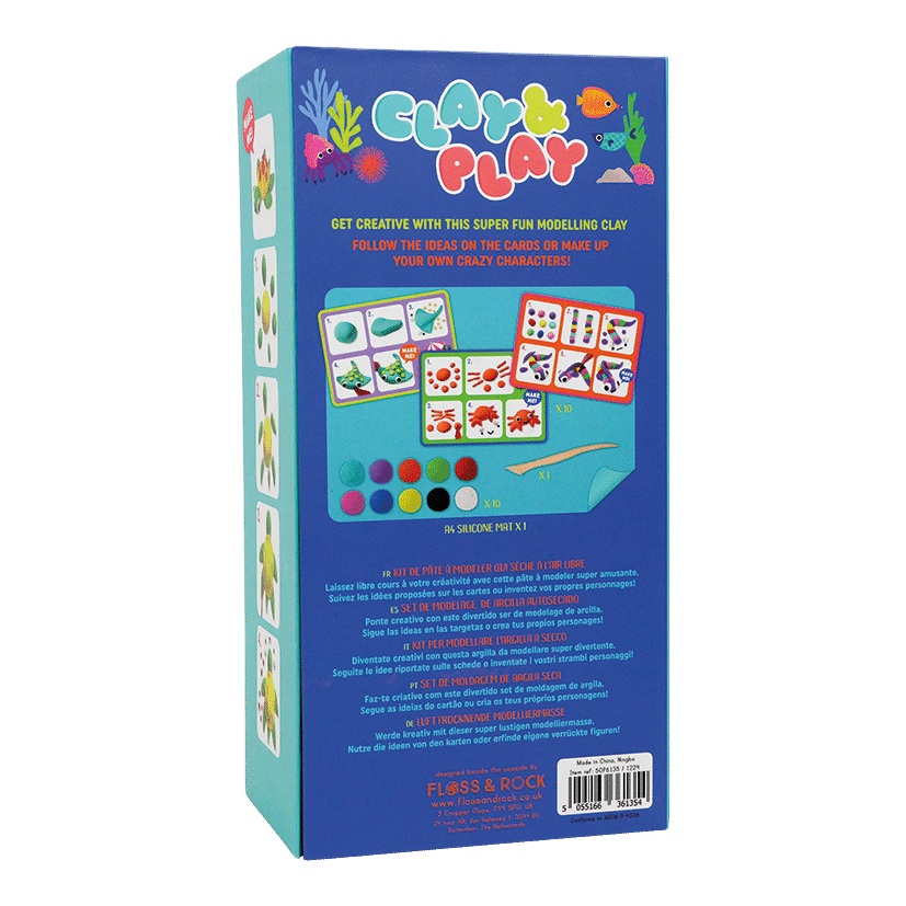 Become a master sculptor and creative genius with Clay & Play! Each set comes with 6 pots of 10 different air dry clay colours, 5 double-sided instruction cards (taking you step-by-step through the creative process), a brightly coloured silicone mat and a handy wooden stylus tool for crafting.