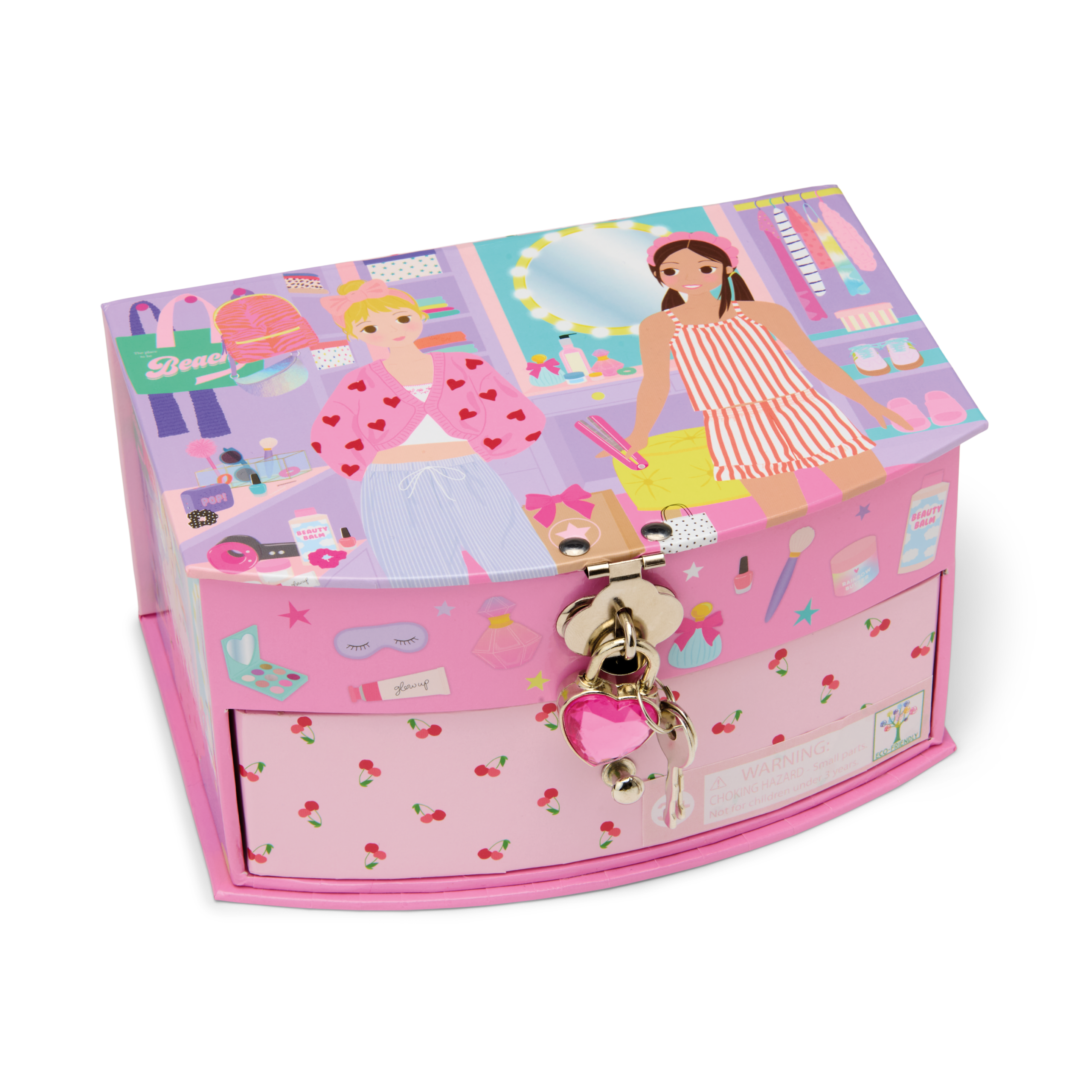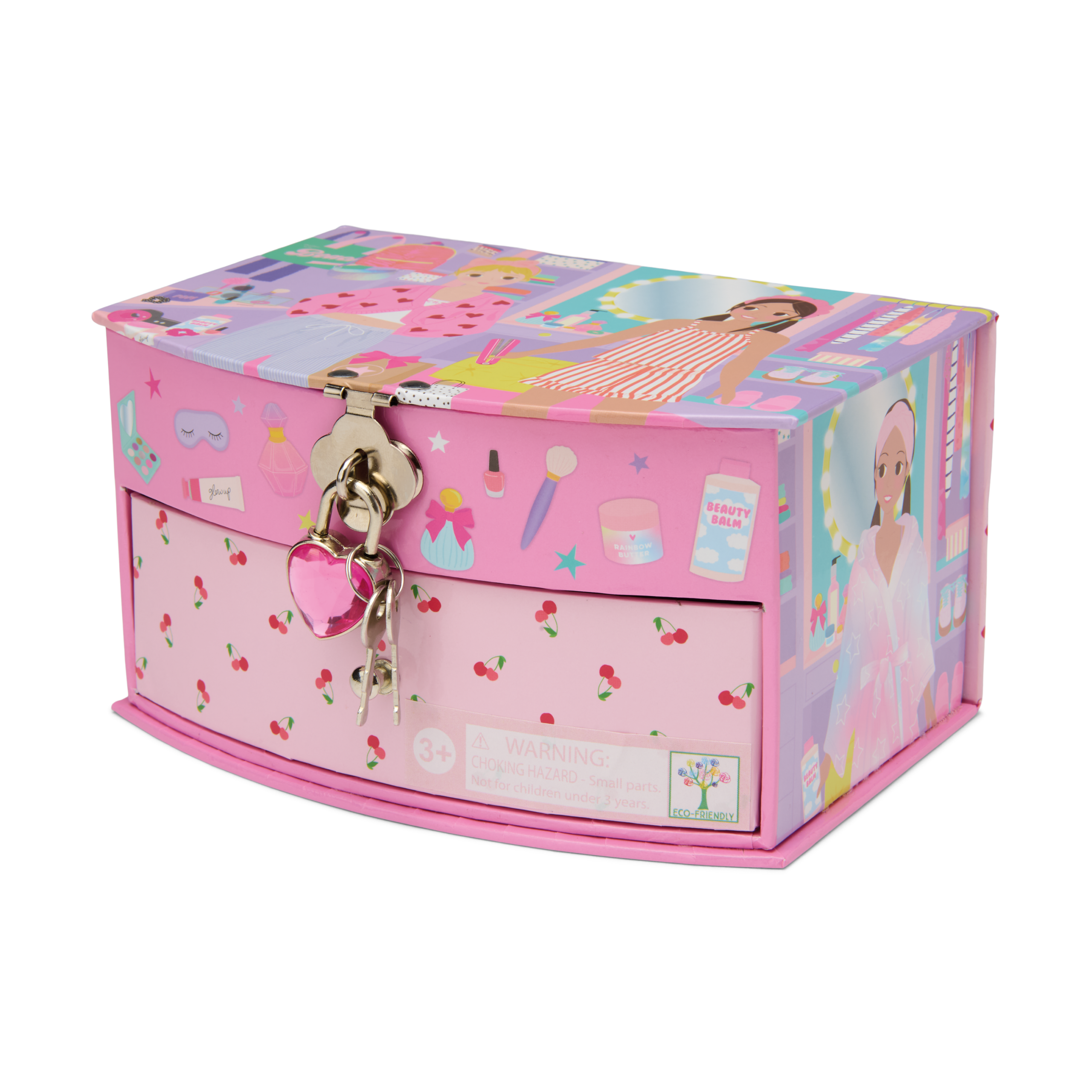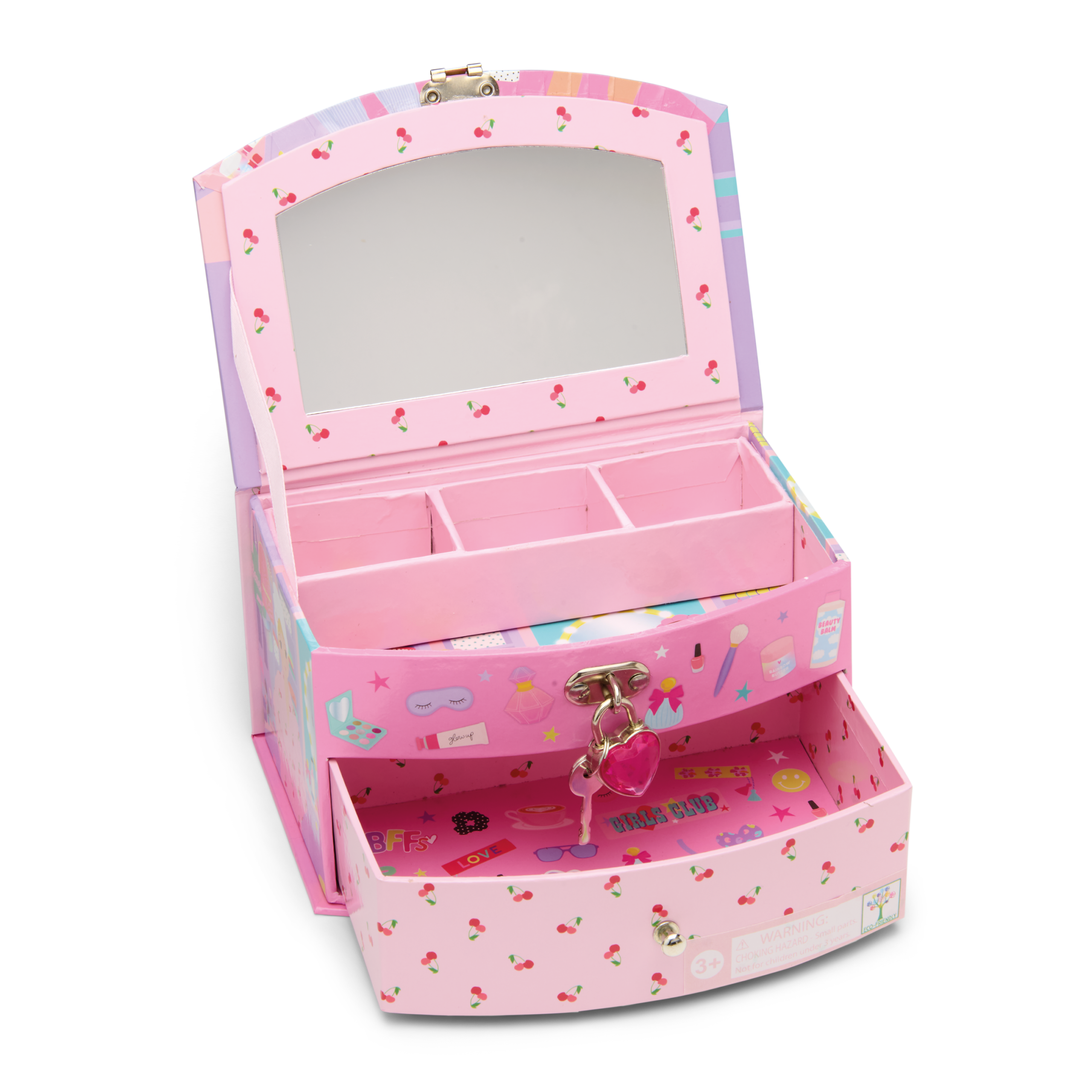 A beautifully decorated lockable Jewellery Box, perfect for fabulous Fashion Friends! Complete with a handy drawer, inner compartments and a mirror. Lock it up and keep your treasures safe with the heart shaped gem padlock (comes with two keys!)
