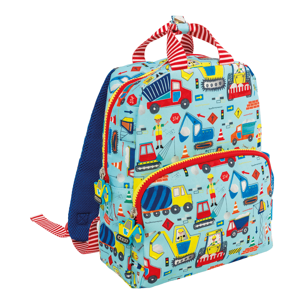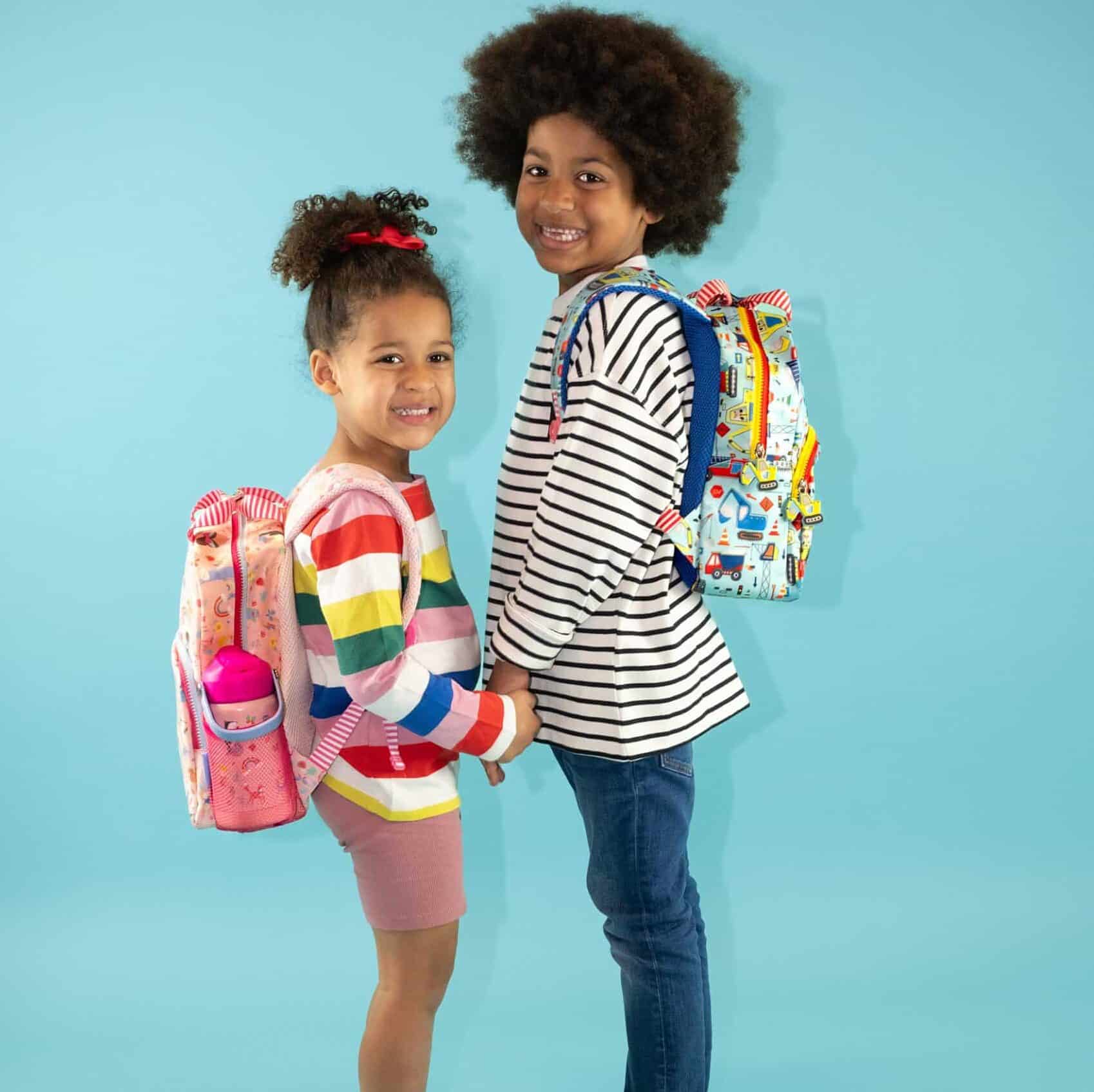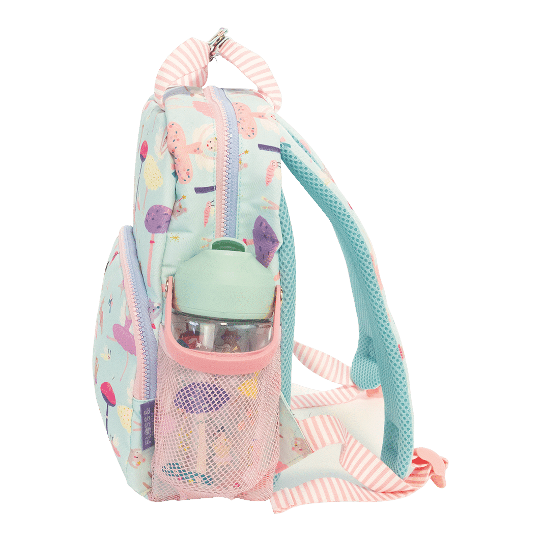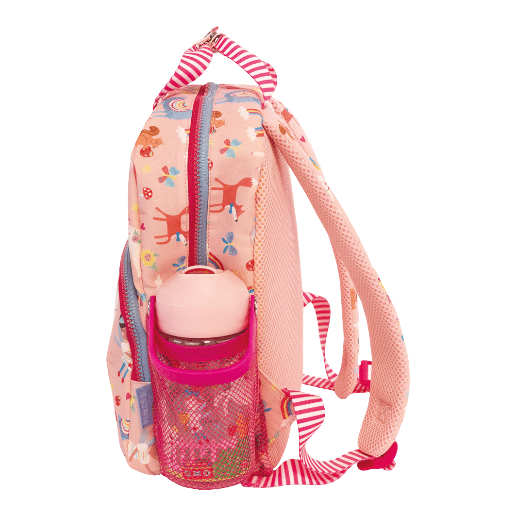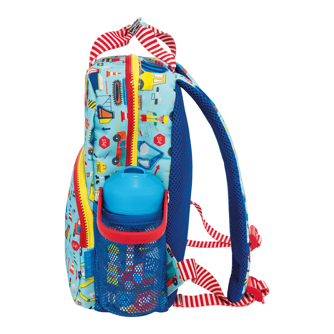 With a handy front pocket, a drinks bottle holder, 2 shaped zip pulls, chunky fun zippers, padded straps for extra comfort and a fully printed lining with sewn in name label.