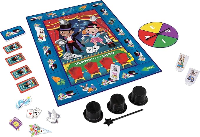 • Includes 1 game board, 13 assistant cards, 1 spinner, 9 magic prop tokens, 4 bunnies with stands, 4 tickets, 1 magic wand, 3 magic hats and instructions.