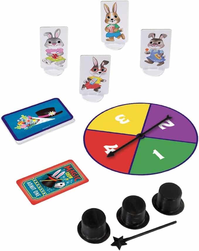 • Includes: 1 game board, 13 assistant cards, 1 spinner, 9 magic prop tokens, 4 bunnies with stands, 4 tickets, 1 magic wand, 3 magic hats and instructions.