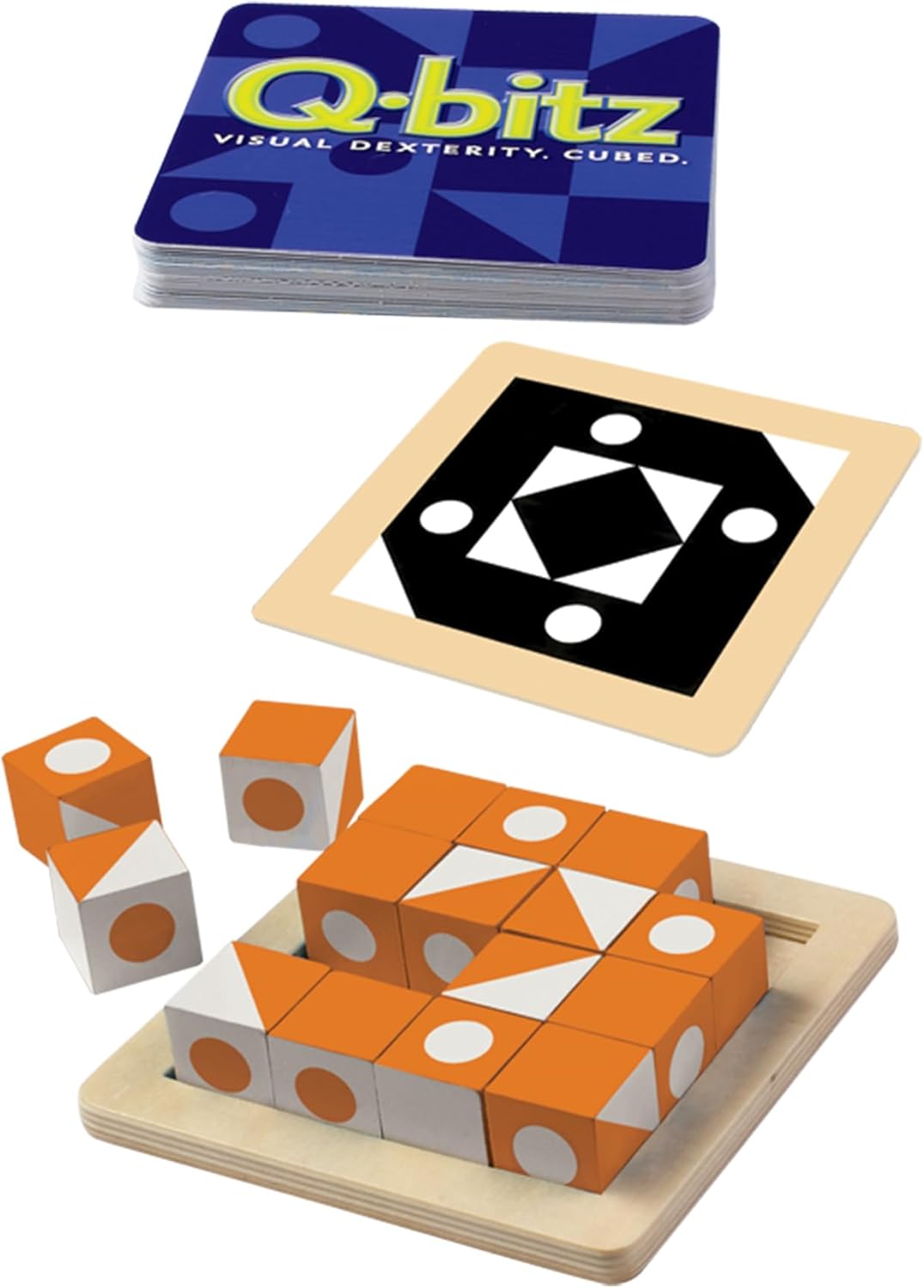 • INCLUDES: Package includes 20 new Q-bitz cards (not found in original set), 1 wooden tray, and 16 challenge cubes.