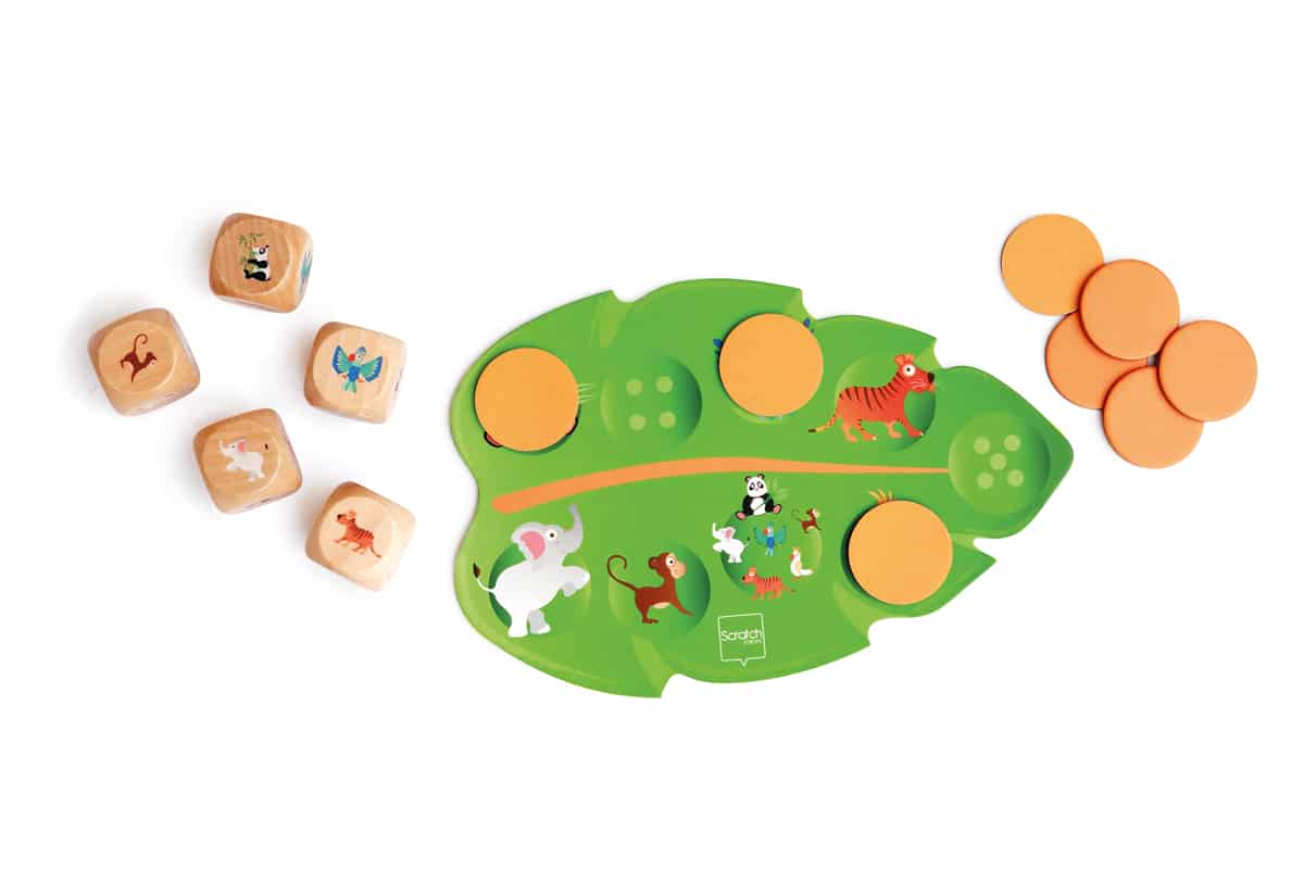 In this simplified variant of the world famous dice game, you don’t need to be able to read to play. The dice show pictures of cute jungle animals. Try to throw the 5 dice with the challenges on your picture. Be the first to fill a row with cards and win the game. Go for a quick win with the ‘Yams’ : When you have thrown the same animal 5 times, you are the winner of the game.